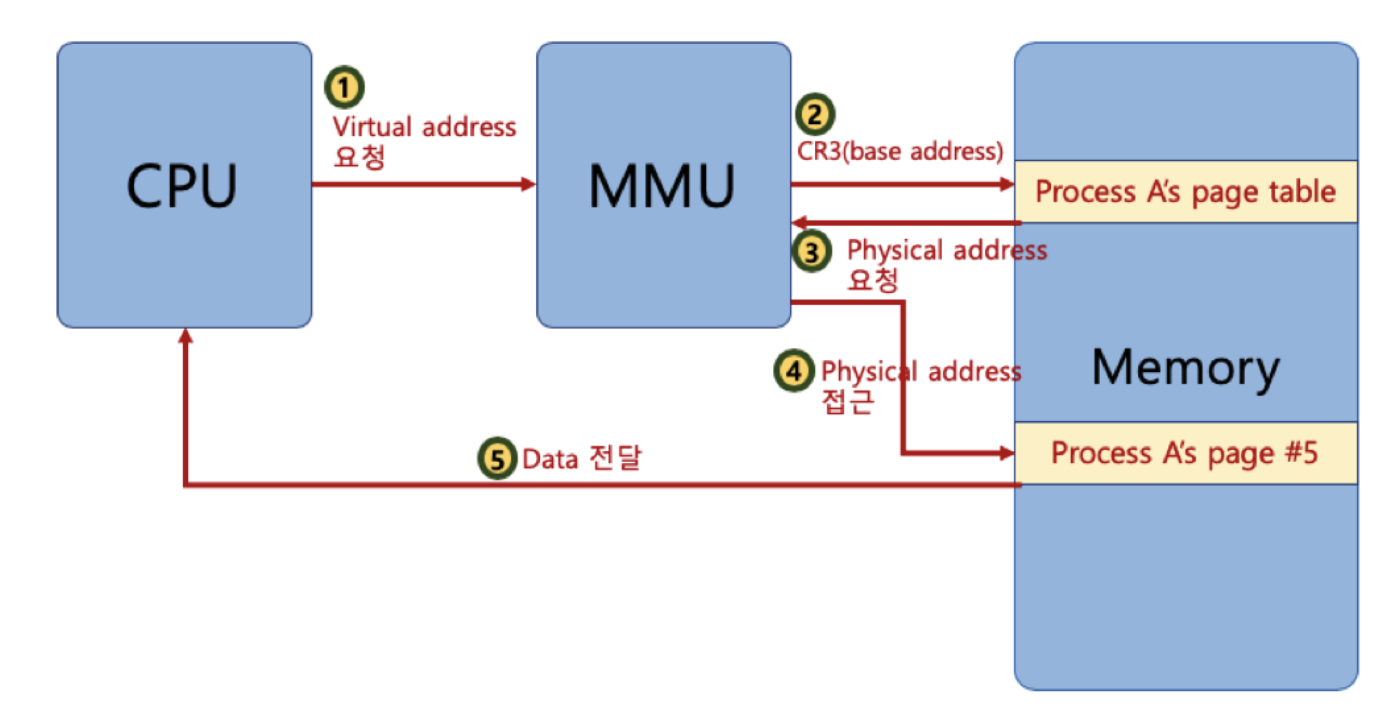 그 후에 CPU가 해당 프로세스의 가상주소를 실행하기 위해 접근하게 되면, MMU가 CR3 레지스터를 가져와서 페이지 테이블 base 주소를 참조해서 물리주소로 변환을 한 다음, 해당 물리주소에 있는 데이터를 CPU에 가져다주게 된다.