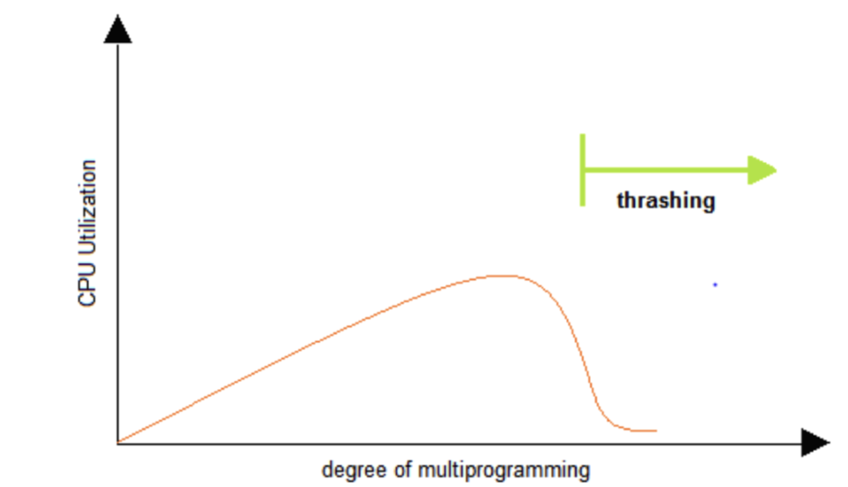 프로그램을 많이 띄워놓으면 어느 순간부터 급격히 떨어질 수 있는데, page fault가 일어나고 page swap 일어나면서 페이지 교체 작업이 수시로 빈출하면서 실제 CPU 동작은 못하고 오로지 page fault, page swap 처리만 하게 되는 것이다.