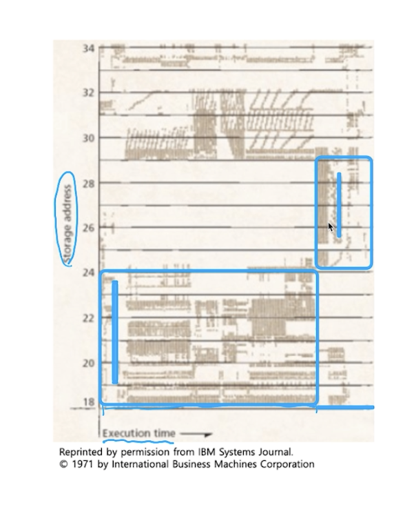 실행 시간에 따라서 그림에 표시한 지역에서 위의 코드처럼 막 for문을 돌면서 실행되고 있는 것이다. 그래서 이런 메모리는 그 코드의 주변을 실행할 가능성이 가장 높다.