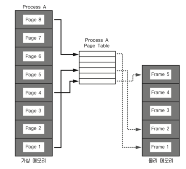 - 크기가 동일한 페이지로 가상 주소 공간과 이에 매칭하는 물리 주소 공간을 관리