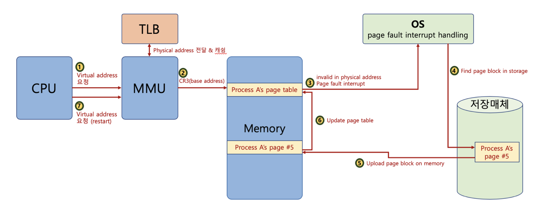 - 그런데 만약 invalid 상태라면 이 때는 page fault interrupt가 운영체제에 던져지게 된다. 운영체제는 page fault interrupt를 처리하기 위해서 해당 페이지를 저장 공간(ex. 실행 파일)에서 갖고 와서 그 해당 데이터를 메모리에 올려준다. 그 다음에 page table을 업데이트하고, CPU에게 재실행을 요청한다. 그러면 CPU는 위 그림의 7번처럼 가상주소를 다시 요청하고 MMU를 타서 해당 메모리에 있는 데이터를 CPU가 가져갈 수 있게 된다.