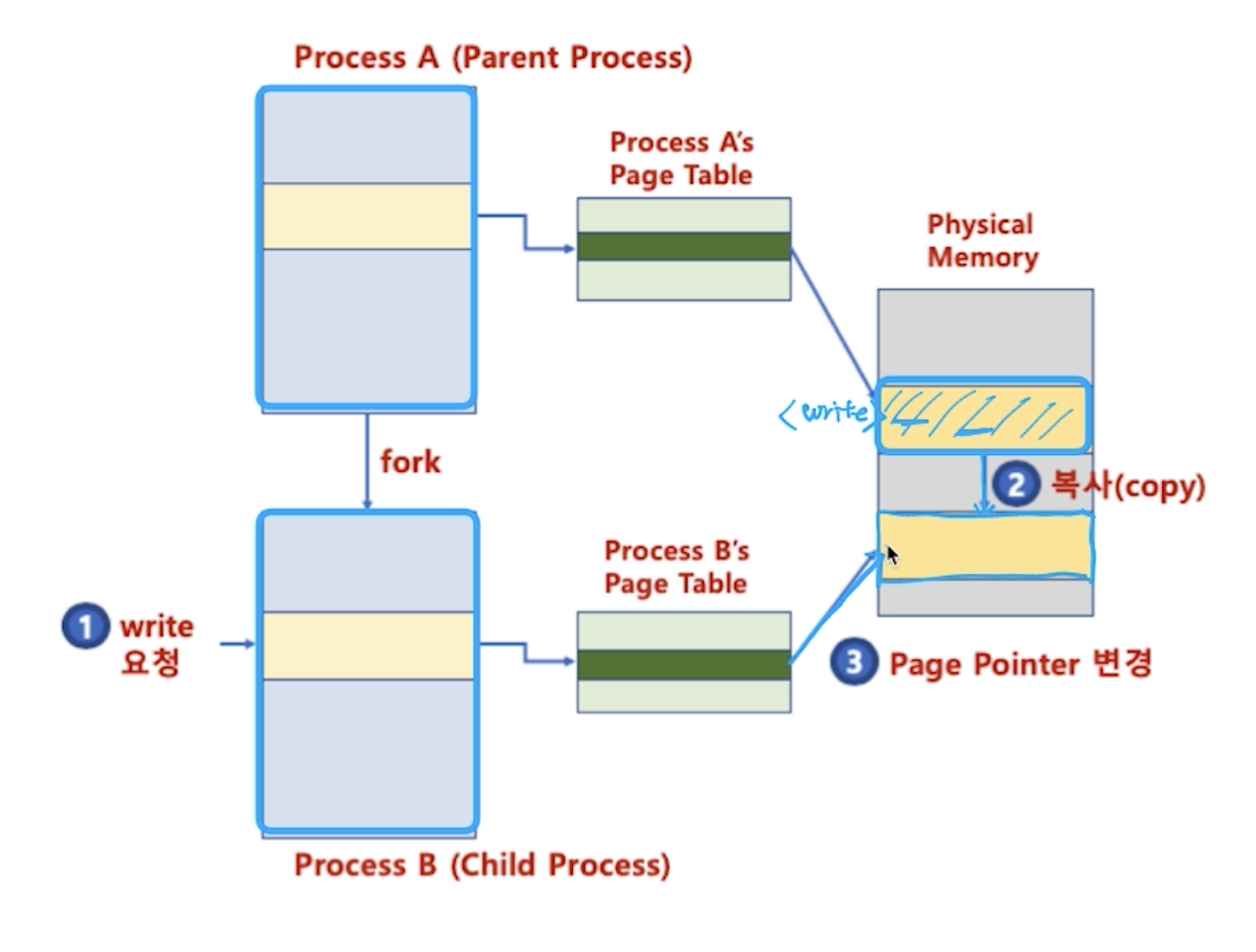 그러나, 만약 새로 생성된 프로세스 또는 원래 프로세스가 해당 물리 메모리의 공간에 write를 하려고 할 때는 프로세스 A가 그 물리메모리에서의 데이터를 변경시킨다고 해서 프로세스 B가 그 변경된 데이터를 갖고 있으면 안 될 것이다. (그 둘은 완전히 다른 프로세스임을 잊지 말자.) 따라서 이 때만 복사를 해서 다른 공간에 놓고, 프로세스 B의 페이지 테이블의 물리주소값을 바꿔놓는다.