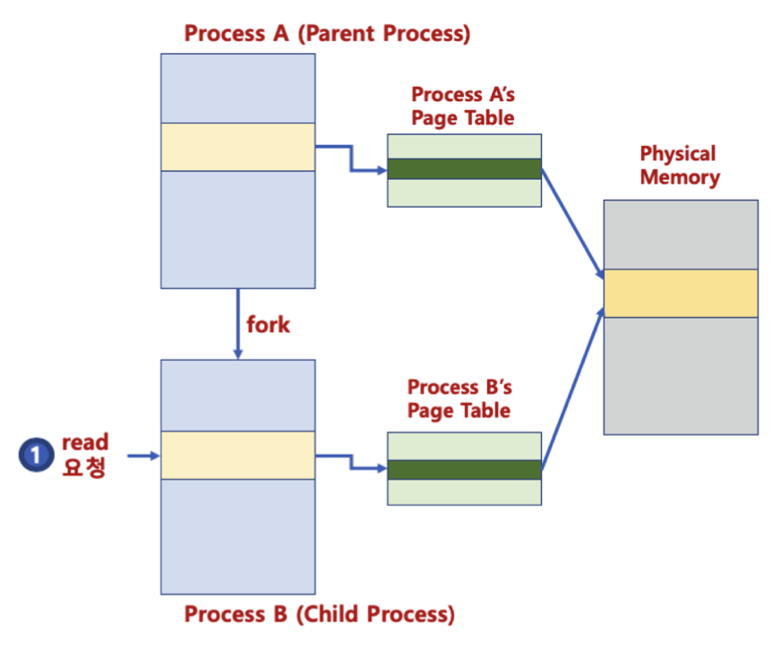 그래서 실제로는 프로세스를 만들 때 그 공간을 복사하지 않는다. 그냥 페이지 테이블에서 프로세스 A의 일부가 들어있는 물리메모리의 공간을 프로세스 B 페이지 테이블도 우선은 가리키게 해놓는다.