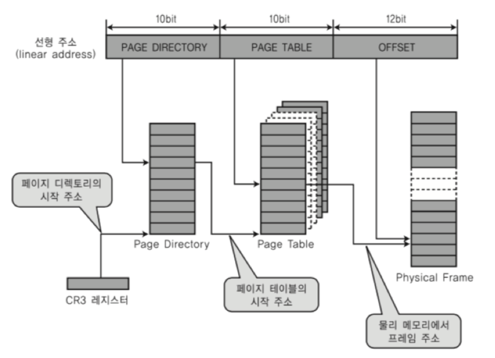 - CR3 레지스터가 전체 페이지 테이블의 맨 앞에 들어가게 되고, 해당 주소에 대응하는 디렉토리로 가면 해당 디렉토리에 대한 페이지 정보를 갖는 페이지 테이블의 맨 앞 정보를 얻게 됨