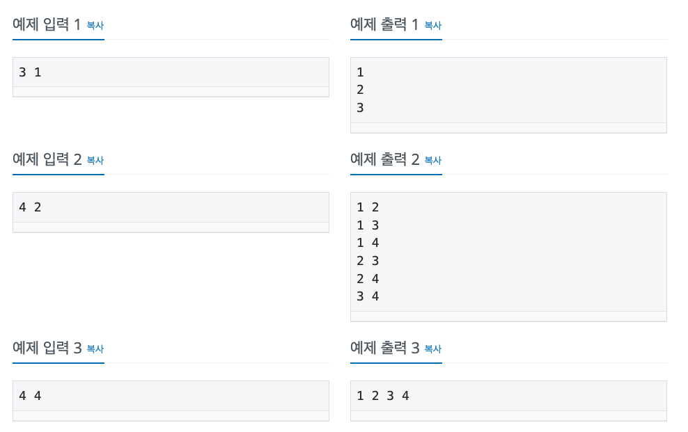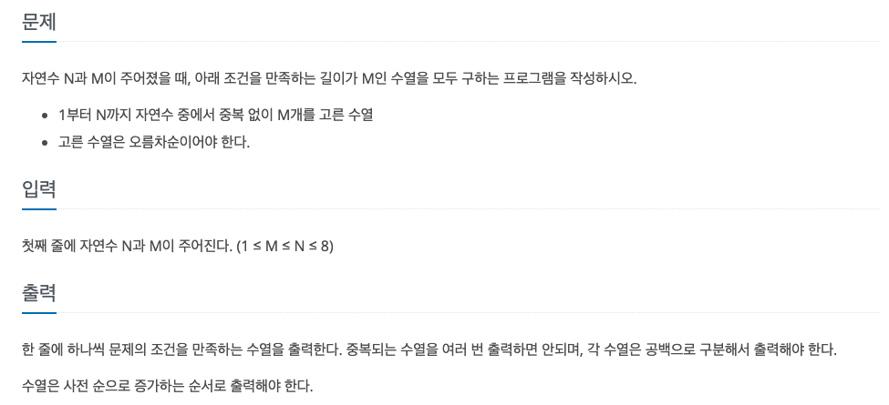 앞서 풀이했던 15649번: N과 M(1) 문제와 유사하며, 문제의 조건이 약간 변형되었다.