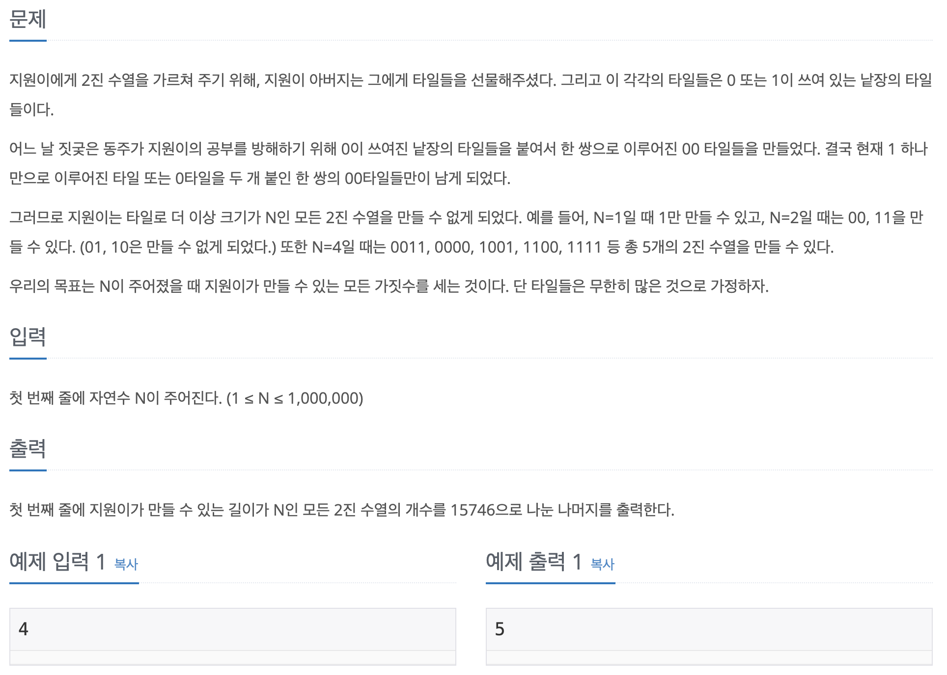 [Algorithm] 1일1솔 - 백준 1904 01타일 (python3) 본문