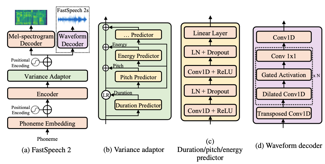 - 한편, 학습 파이프라인을 보다 간소화하기 위한 방안으로 text에서 바로 waveform을 생성하여 fully end-to-end 시스템으로 수 있행될 수 있는 FastSpeech2s를 제안
