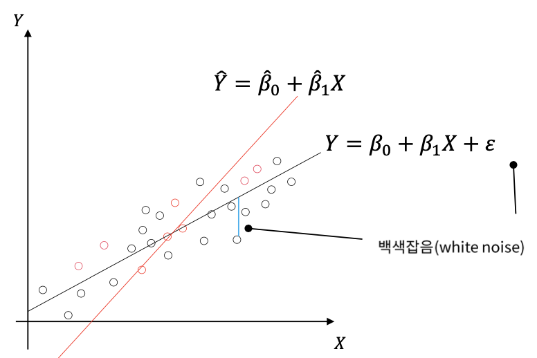 - 실제 $\beta_{0}$과 $\beta_{1}$은 구할 수 없는 계수로 데이터(학습집합)를 통해 이 둘을 추정해서 사용한다.